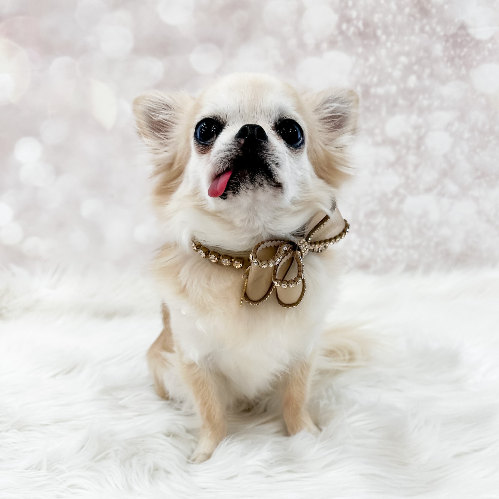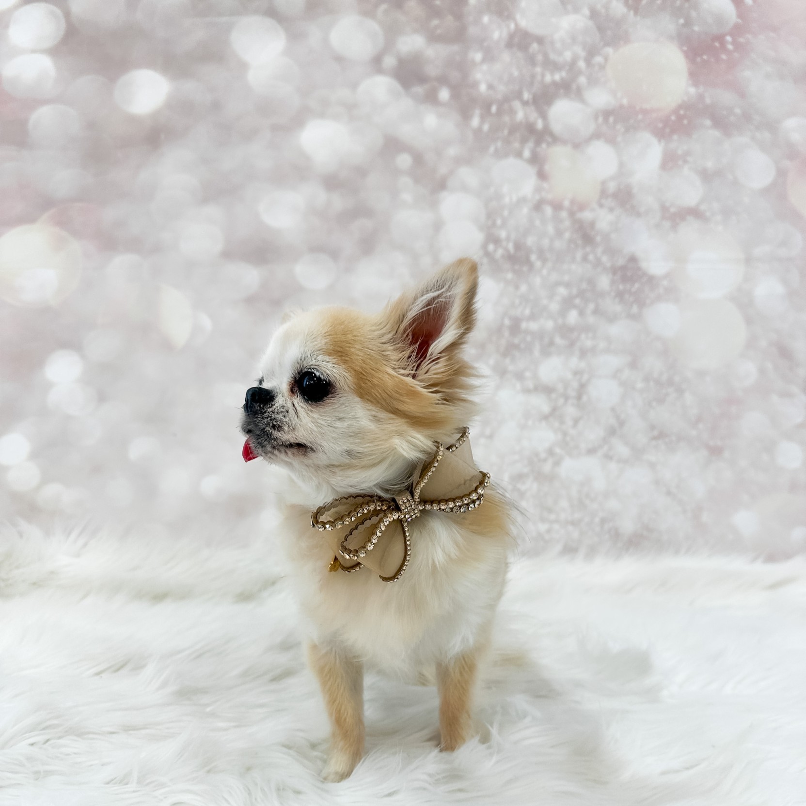 Il nuovo fantastico collare con il bellissimo fiocco in leggerissima rete tempestato di cristalli e con catena di pietre scintillanti vi farà innamorare.