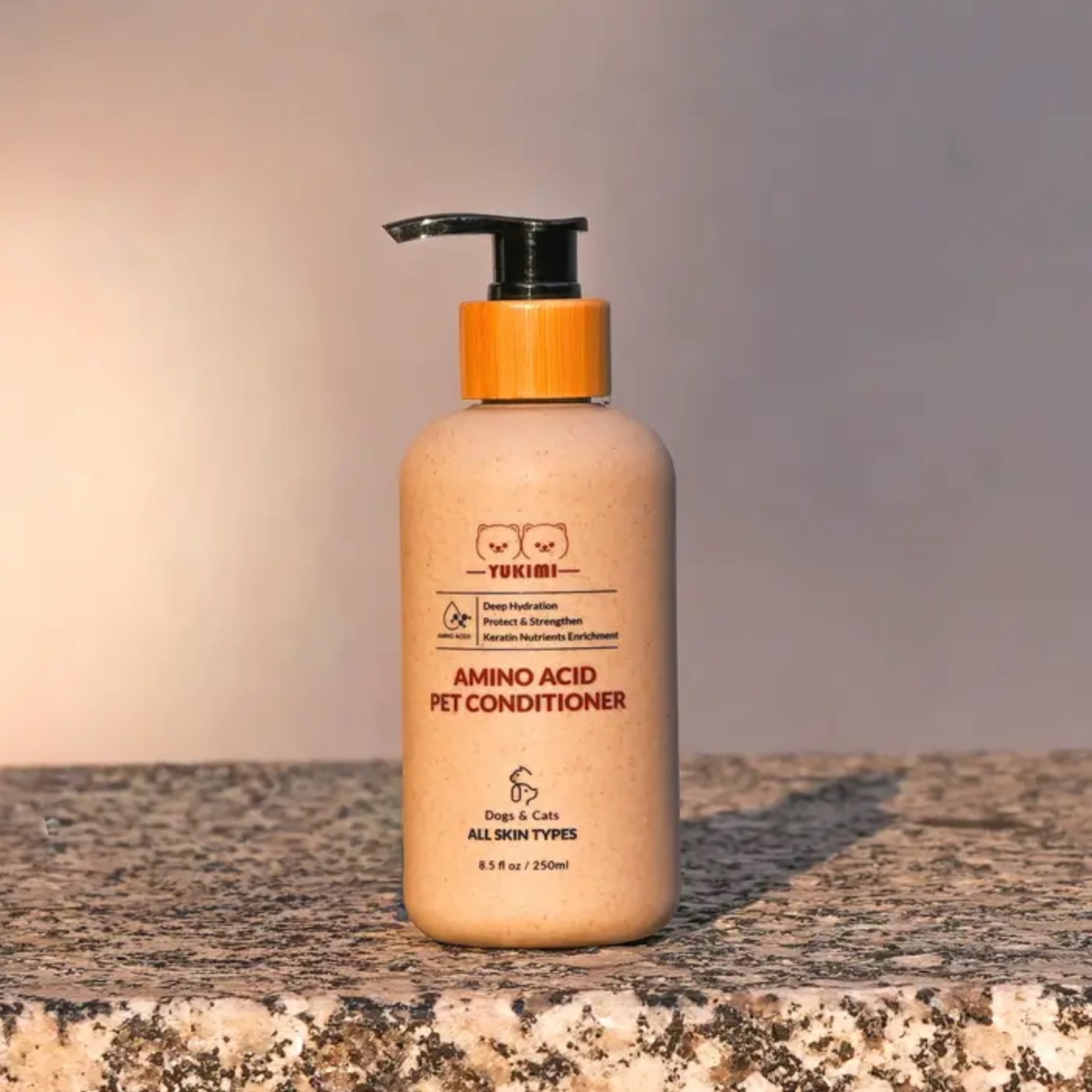 La formula ipoallergenica e a pH bilanciato di YUKIMI Amino Acid Pet Conditioner, arricchita con ingredienti attivi di alta qualità, dona energia al mantello, rinforza il pelo, ne ripristina l'elasticità e reintegra l'idratazione profonda.