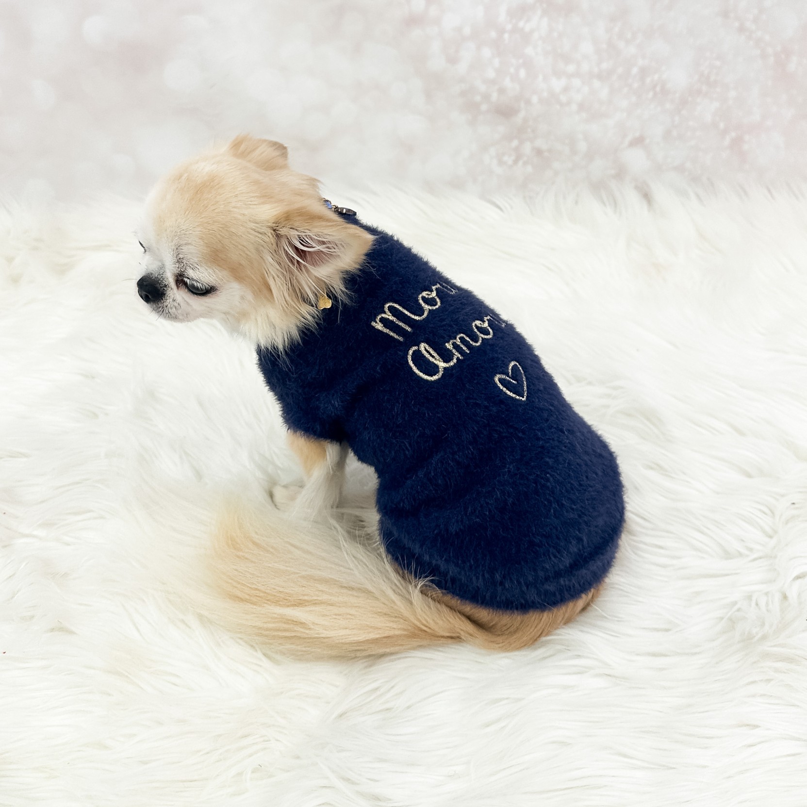 Maglioncino ultra soffice con ricamo MORE AMORE sulla schiena — per cani (e padroni) che amano distinguersi con stile e tenerezza.
