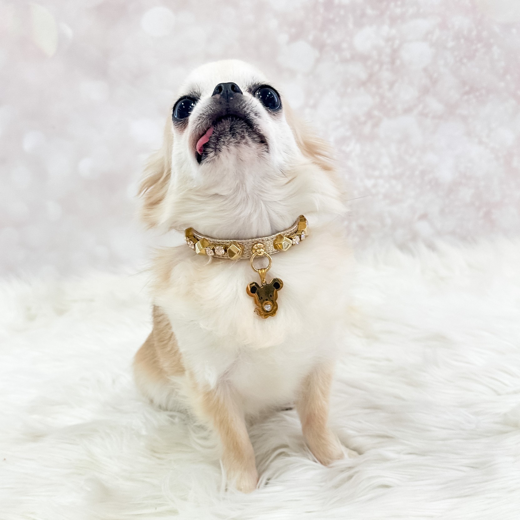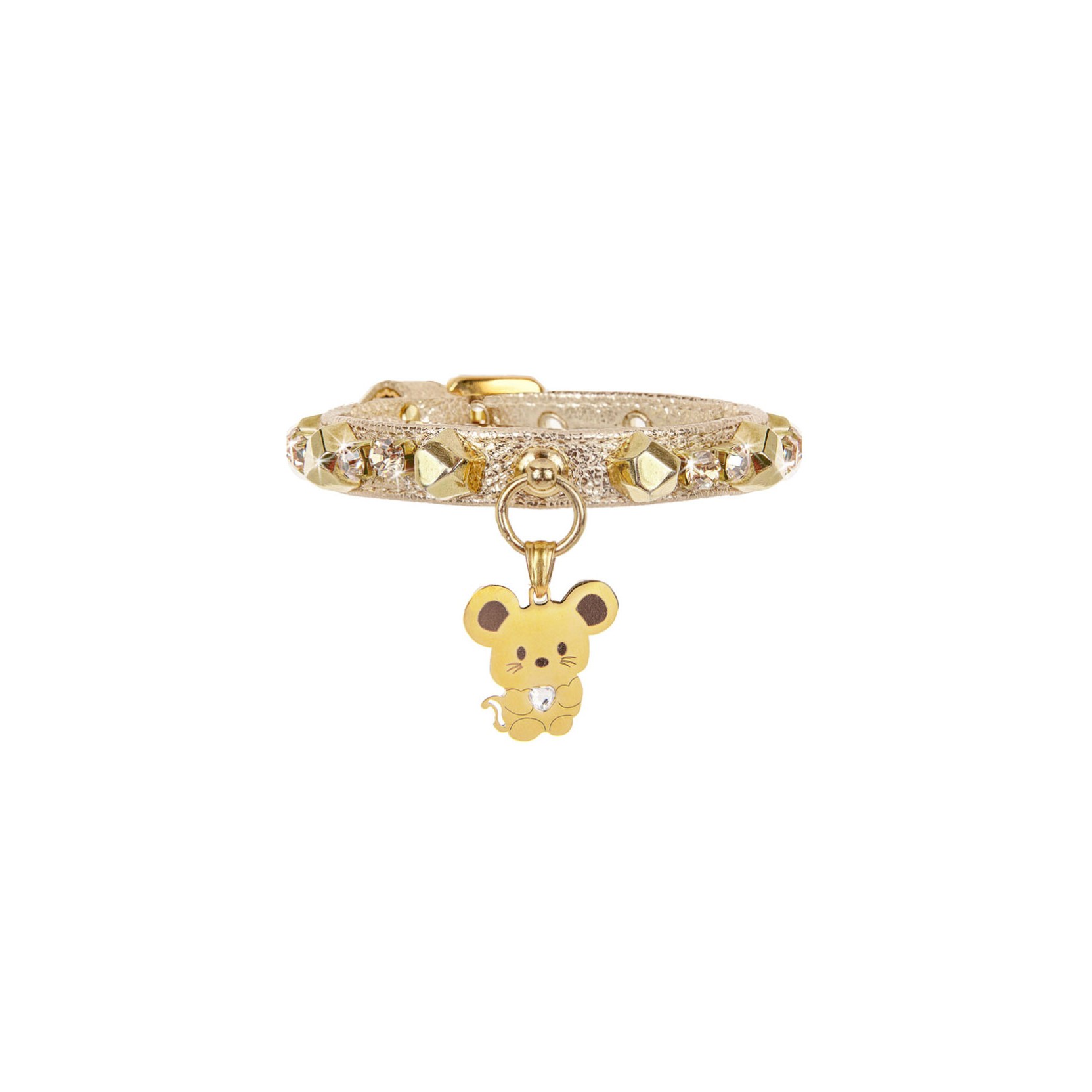 Le nuove fantastiche borchiette a forma di pepita, scintillanti cristalli e la nostra medaglietta a forma di TopoMio arricchiscono questo morbido collare in ecopelle.