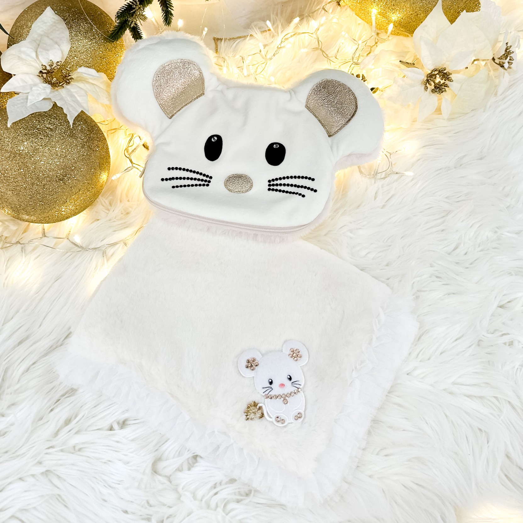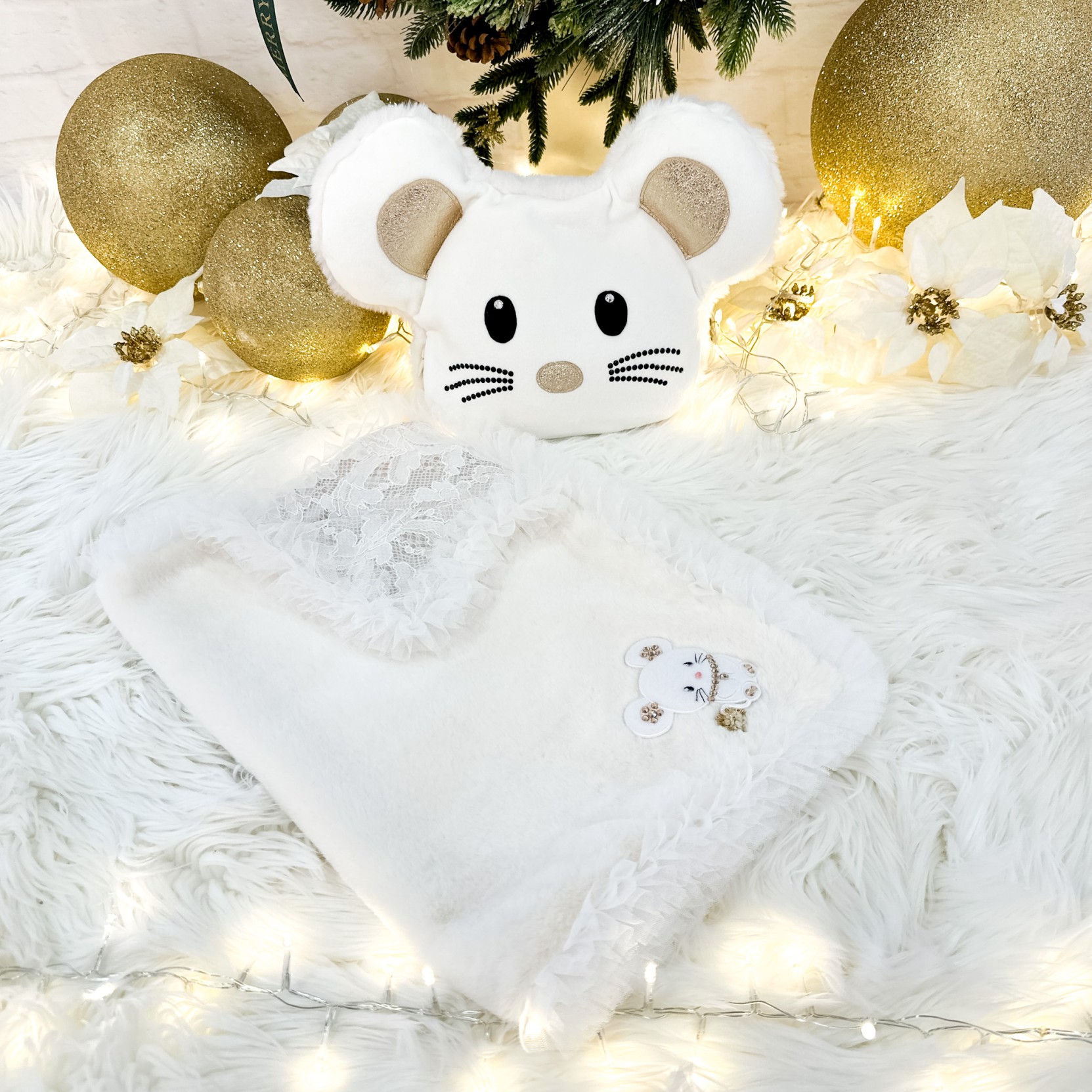 Il dolce cuscinetto a forma di TopoMio realizzato in morbida ciniglia ed ecopelliccia, nasconde al suo interno una fantastica copertina in calda ecopelliccia e pizzo decorata con il nostro amato TopoMio cristallizzato.
