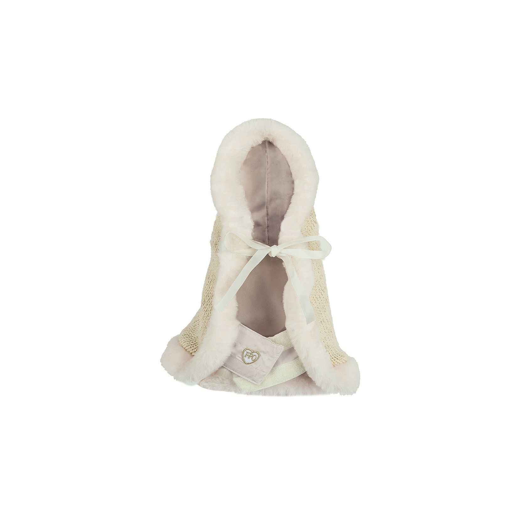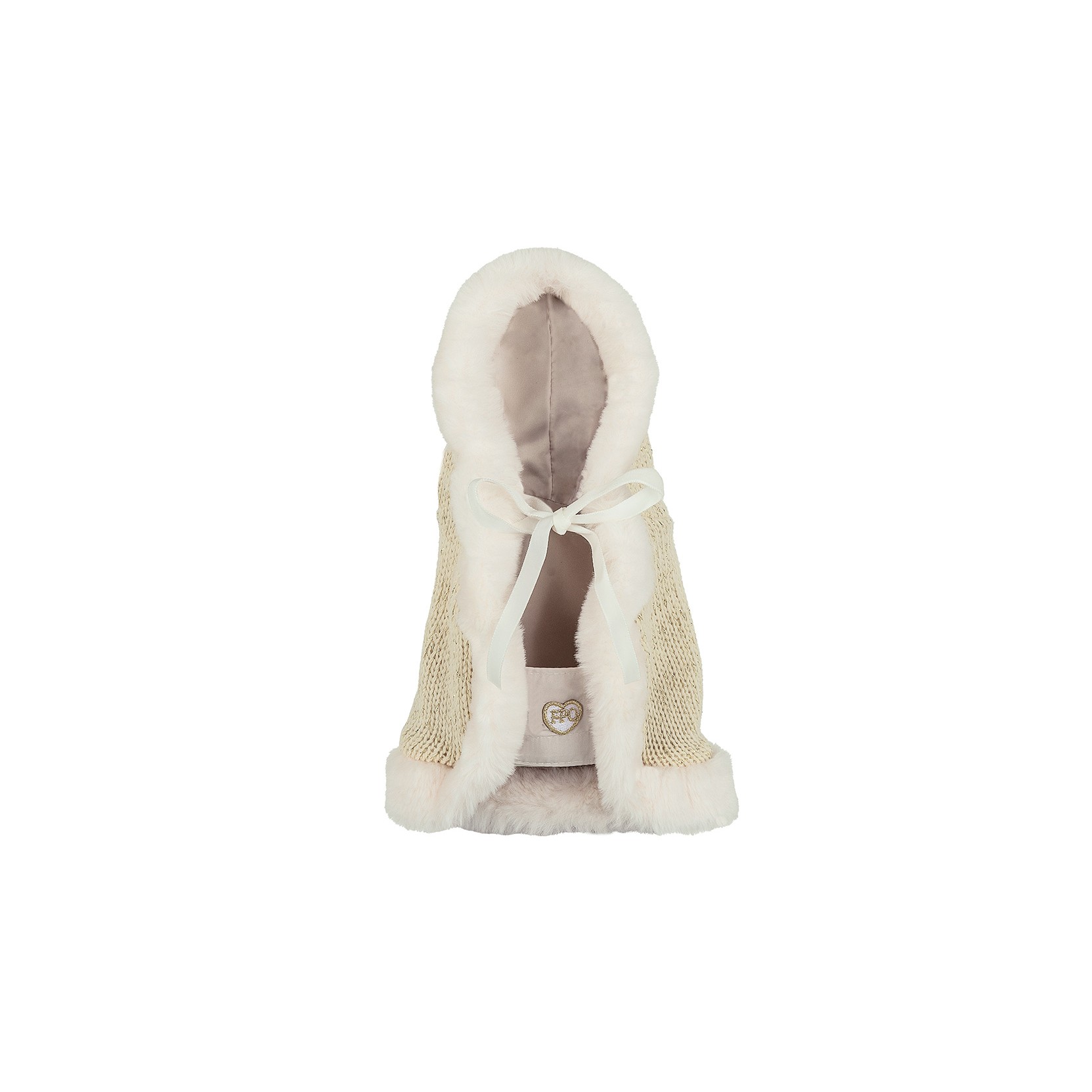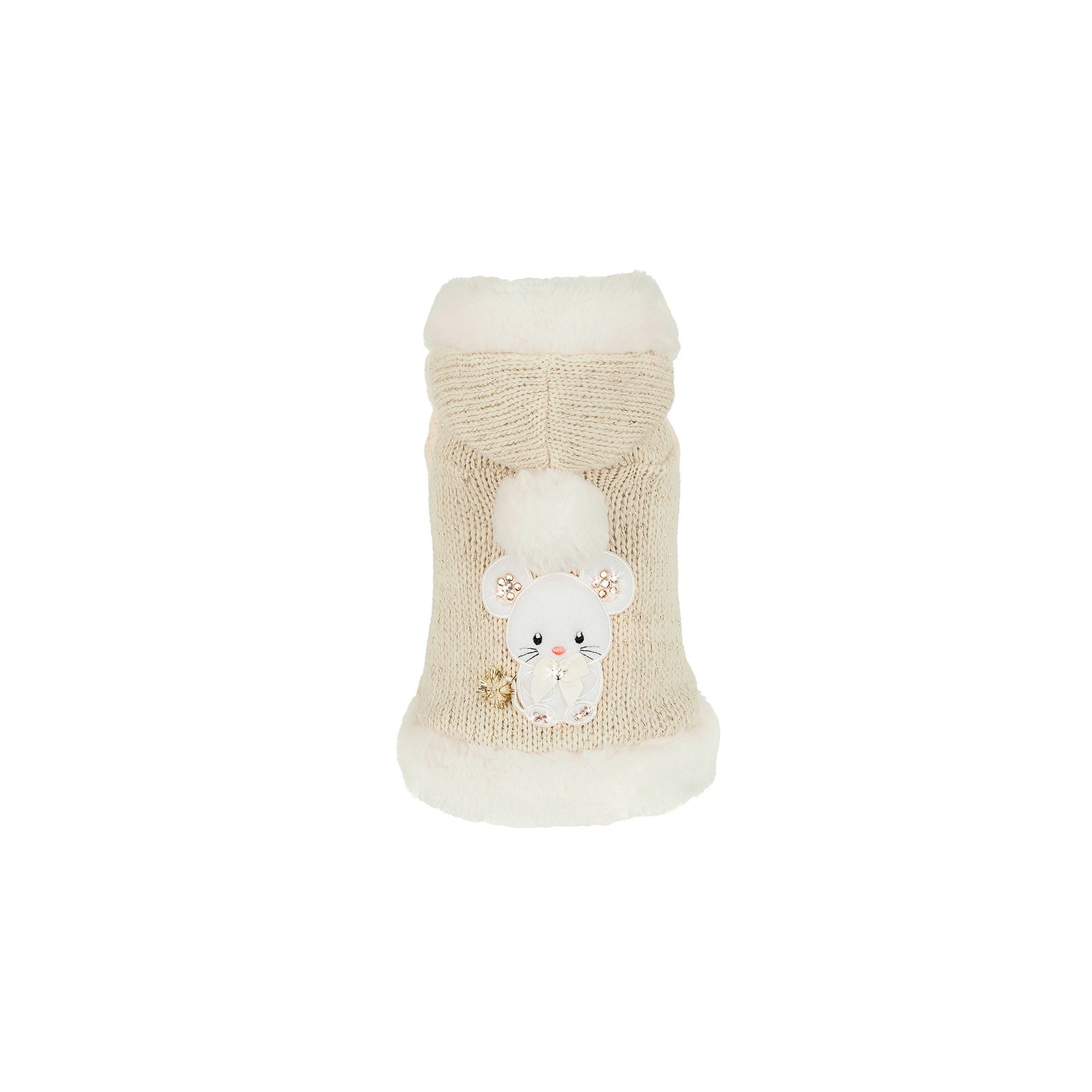 La bellissima mantellina in calda lana e lurex bordata in ecopelliccia è decorata con un adorabile TopoMio scintillante e un dolce pon pon sul cappuccio.