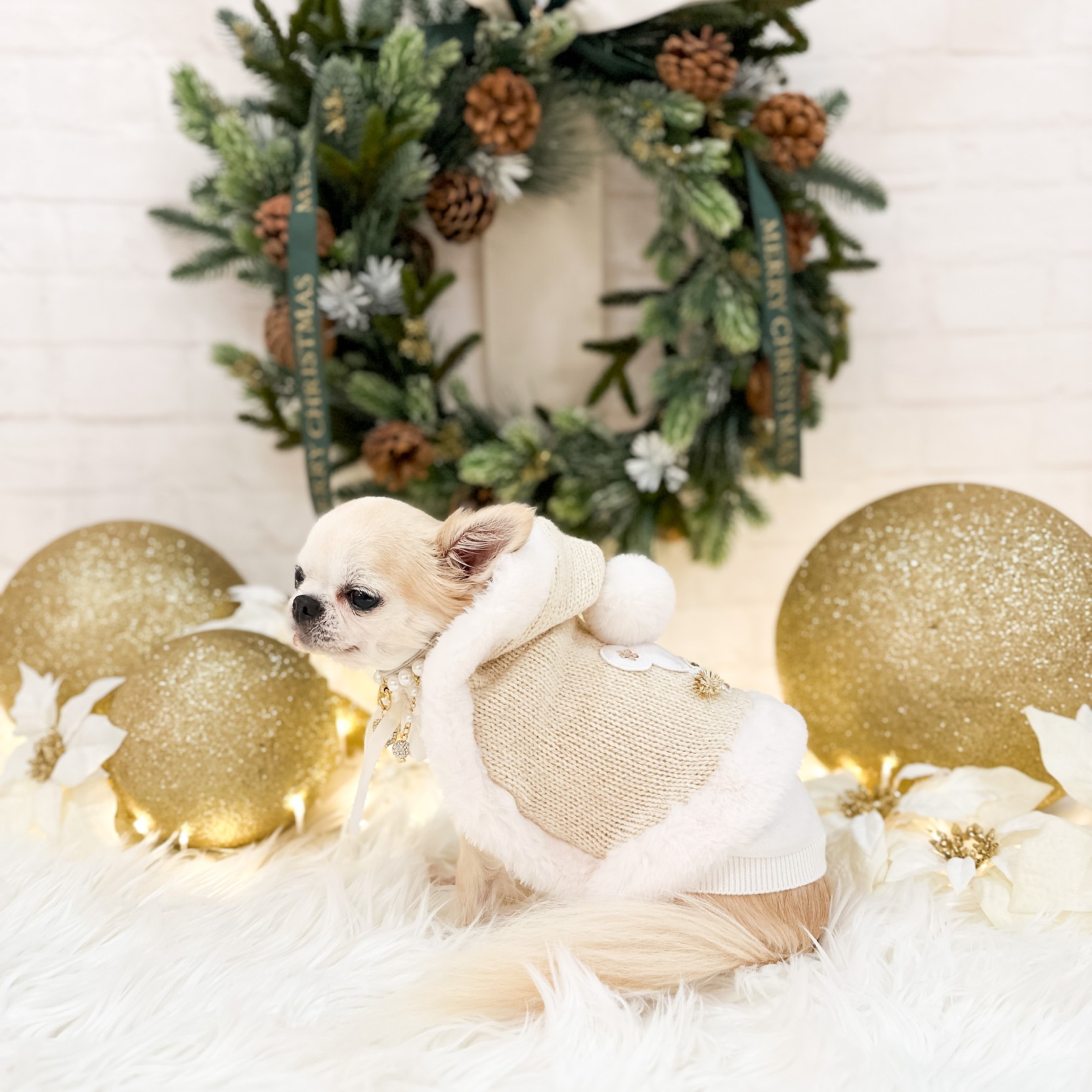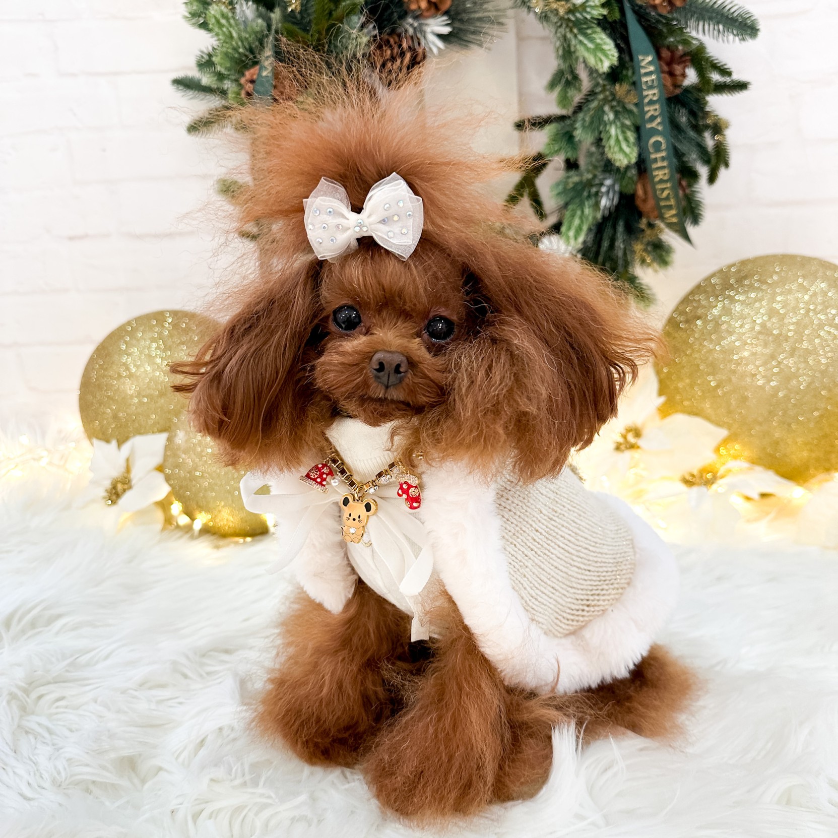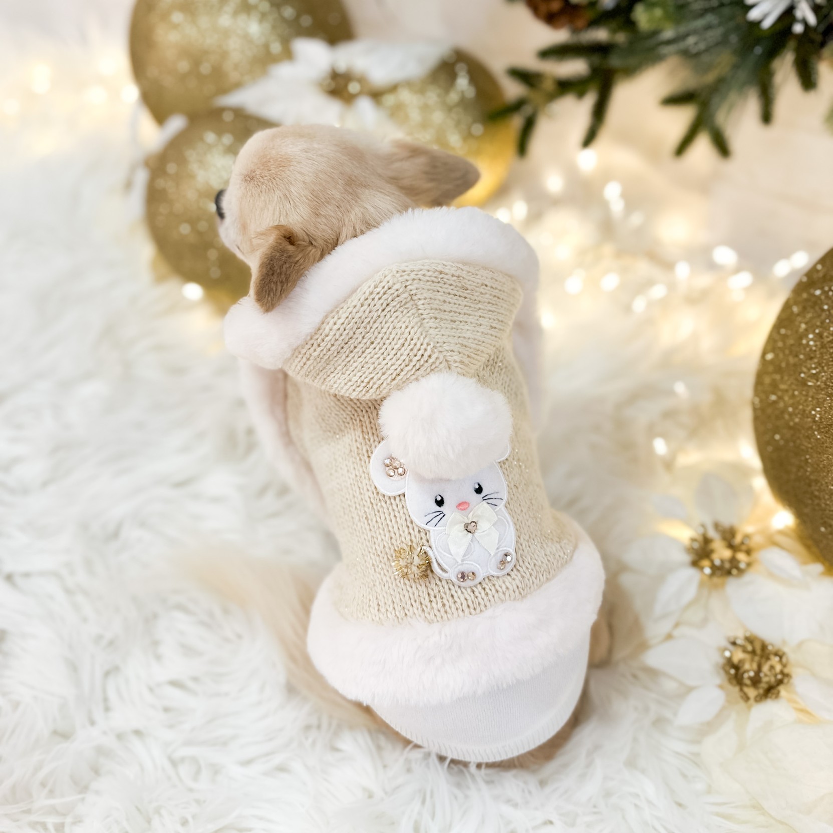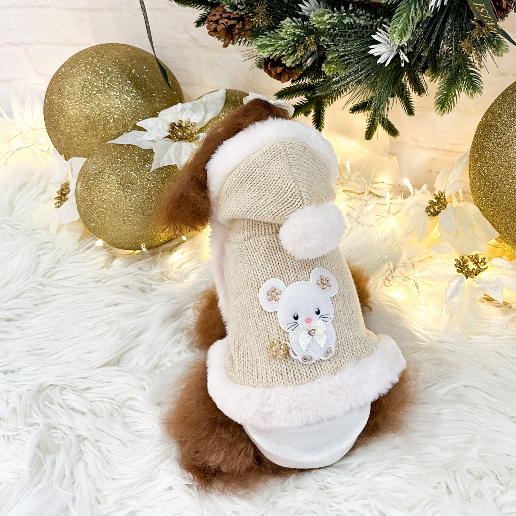La bellissima mantellina in calda lana e lurex bordata in ecopelliccia è decorata con un adorabile TopoMio scintillante e un dolce pon pon sul cappuccio.