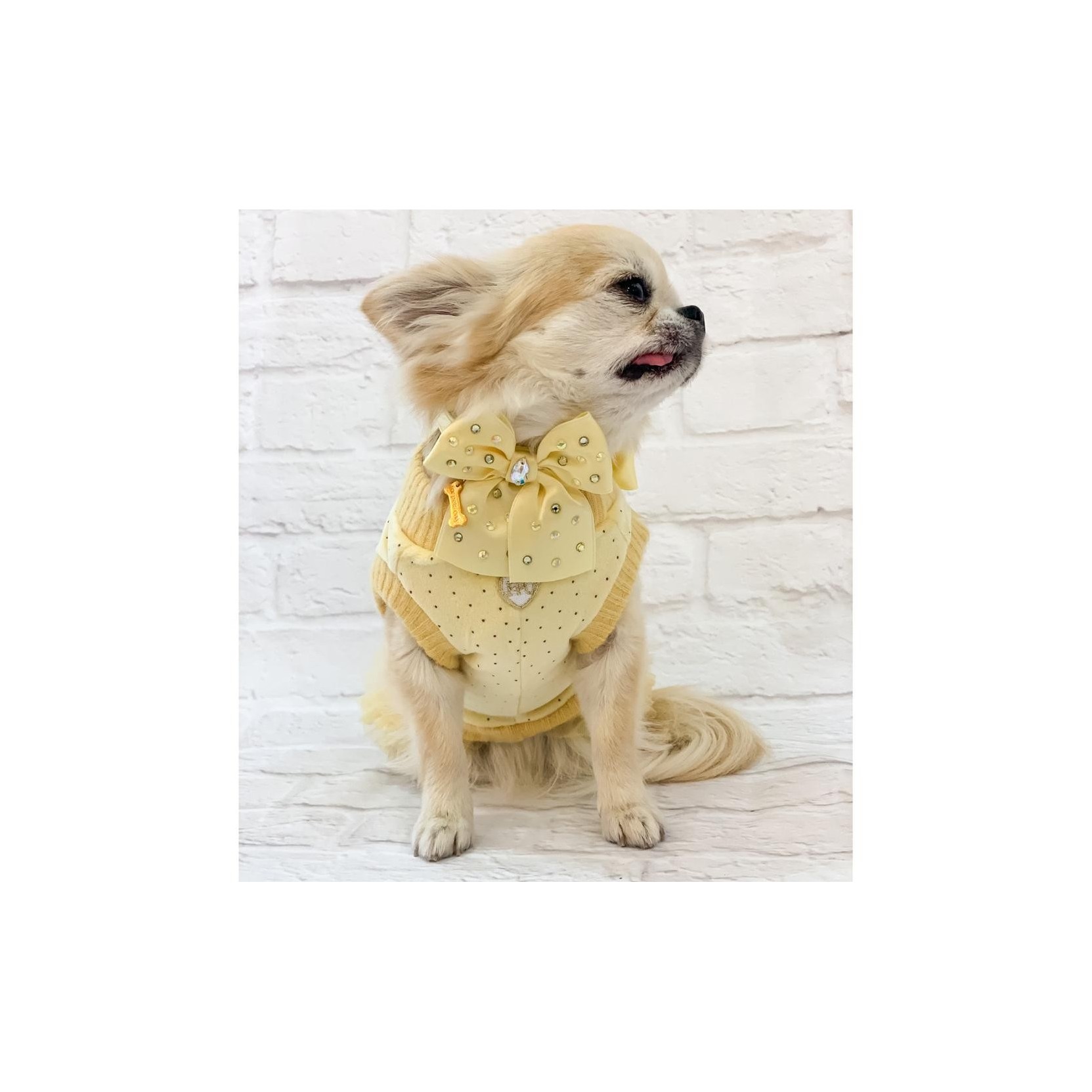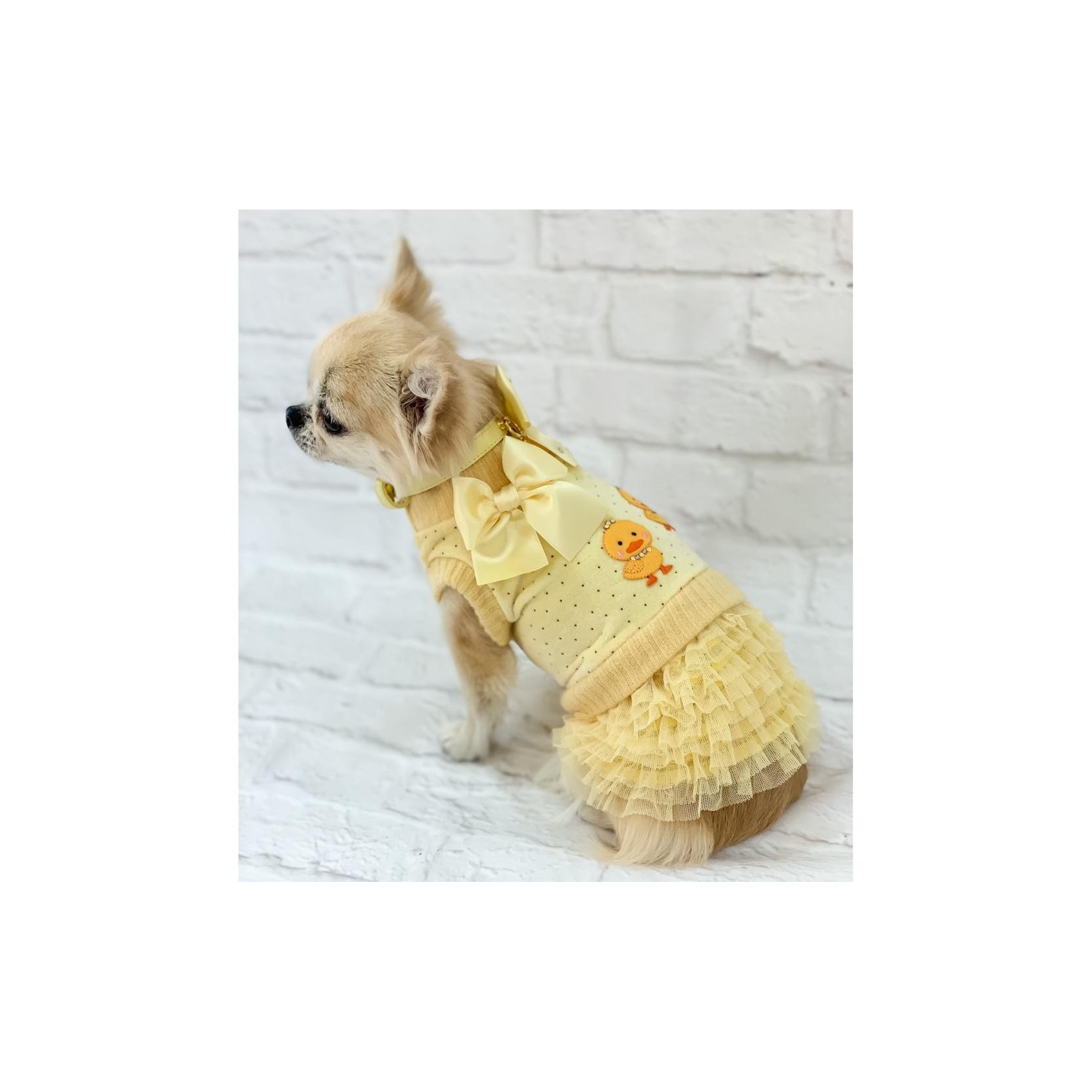 Delizioso vestitino in morbidissima ciniglia e balze in tulle, impreziosito da due tenere paperelle decorate con cristalli e un dolce fiocco spilla in raso staccabile.